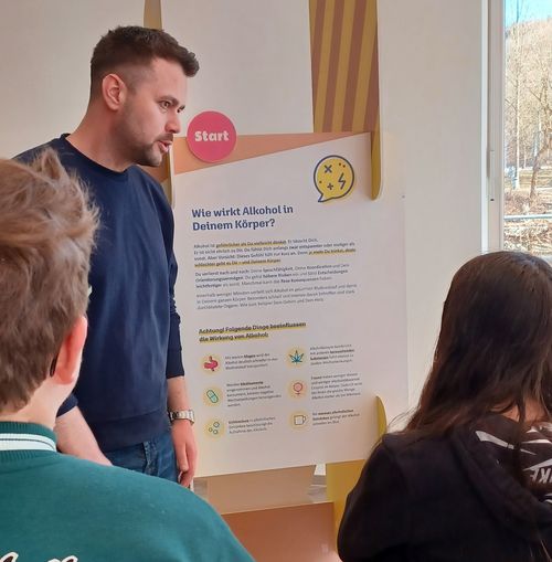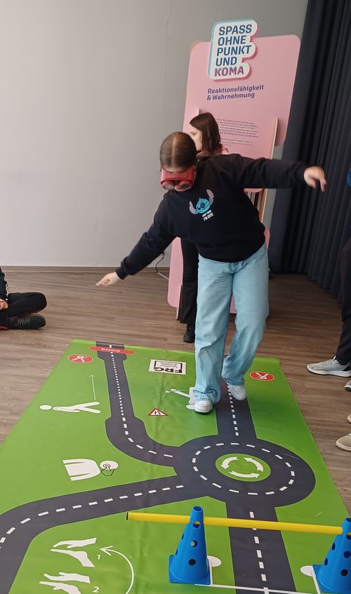 An interaktiven Stationen konnten die Jugendlichen Erfahrungen sammeln: Beim Alkoholbrillen-Parcours wurde deutlich, wie sehr Alkohol die Koordination beeinträchtigt. Auch die stabile Seitenlage wurde geübt – eine wichtige Erste-Hilfe-Maßnahme bei Alkoholvergiftungen.