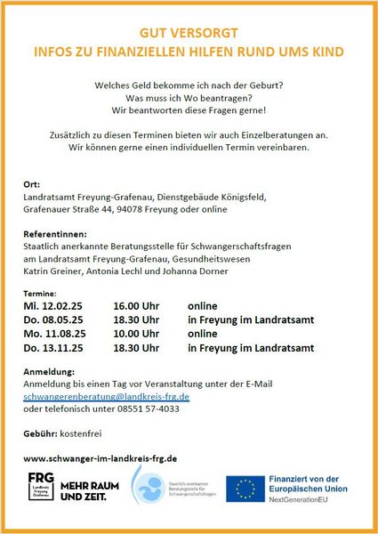 Anmeldung bis einen Tag vor Veranstaltung unter der E-Mail schwangerenberatung@landkreis-frg.de oder telefonisch unter 08551 57-4051, -4033, -4054 oder -4060