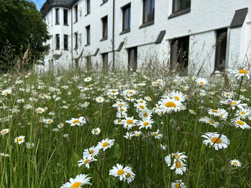 Doch nicht nur Neupflanzungen, auch die Pflege bestehender Flächen wird zunehmend ökologischer gestaltet. So werden Rasenflächen, etwa vor dem Dienstgebäude Königsfeld oder an der Böschung vor der Physiotherapieschule in Freyung, nur noch ein- bis zweimal jährlich gemäht. Der Landkreis will damit die Artenvielfalt fördern. „Kurz gemähter Rasen wirkt zwar ordentlich, bietet ökologisch aber kaum Nutzen“, erklärt Lena Fröhler. „Wenn Flächen seltener gemäht werden, entstehen wertvolle Lebensräume für Insekten und andere Tiere.“ Ausgewählt hatte die Kreisfachberaterin die Flächen zusammen mit den zuständigen Hausmeistern.
