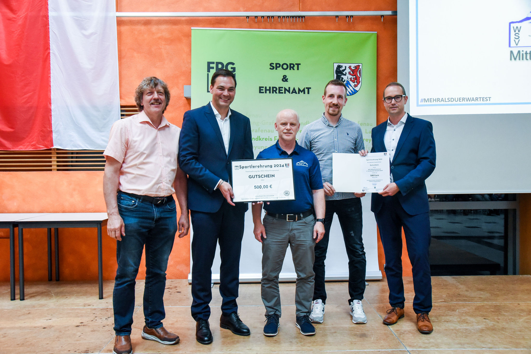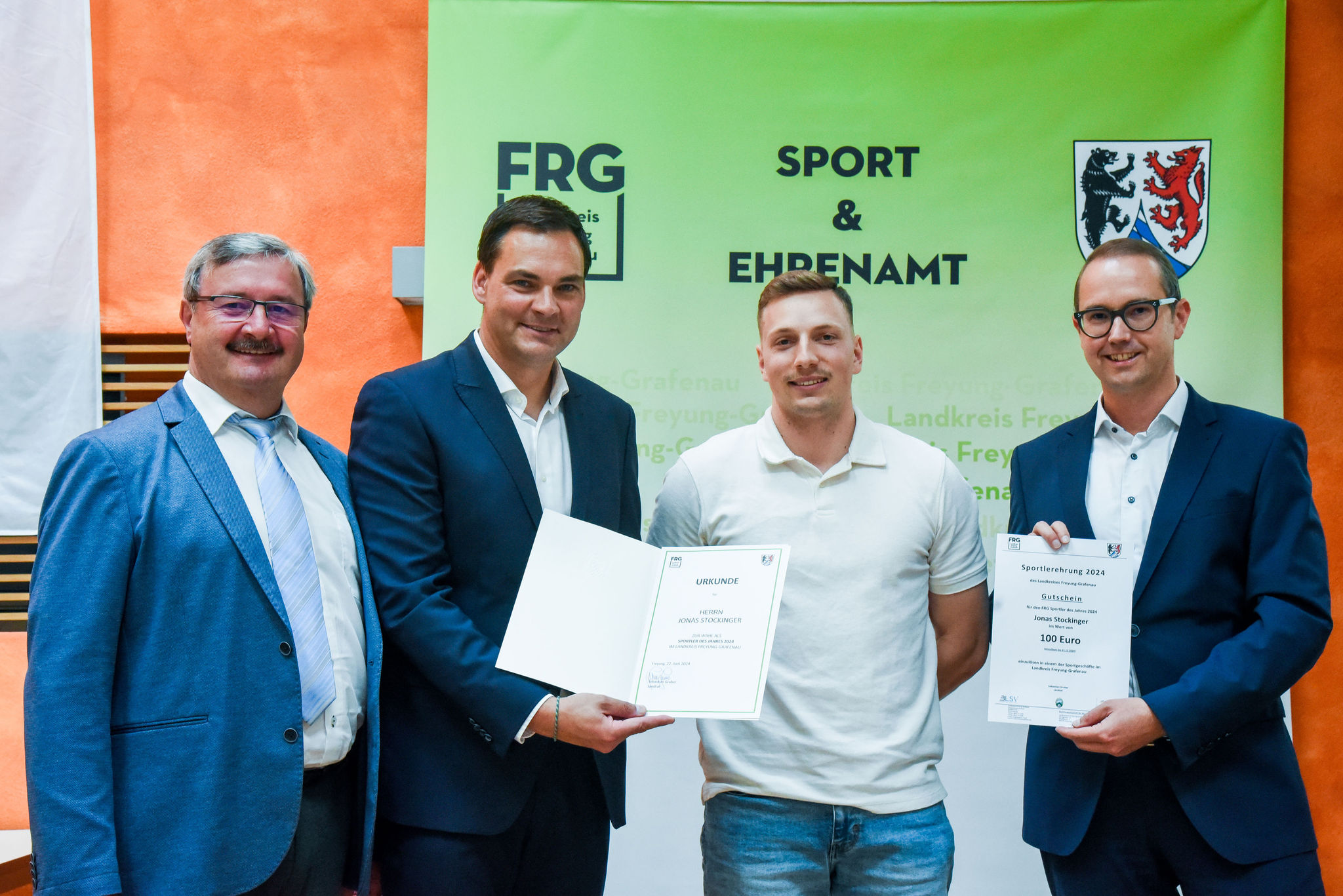 Die besten Sportlerinnen und Sportler des Landkreises Freyung-Grafenau wurden durch Landrat Sebastian Gruber im Rahmen der Sportlerehrung 2024 für ihre besonderen sportlichen Leistungen geehrt. Sie haben in entscheidenden Momenten bei regionalen, nationalen und internationalen Titelkämpfen herausragende Leistungen erbracht. Insgesamt wurden an 54 Sportlerinnen und Sportler Auszeichnungen in Bronze, Silber oder Gold überreicht. Außerdem wurde der WSV Mitterfirmiansreut bei der Vereinsehrung für seine erfolgreiche Jugend- und Nachwuchsarbeit ausgezeichnet. Die wahlberechtigten Sportlerinnen und Sportler wählten Skirennläufer Jonas Stockinger vom SC Herzogsreut zum FRG-Sportler des Jahres 2024.