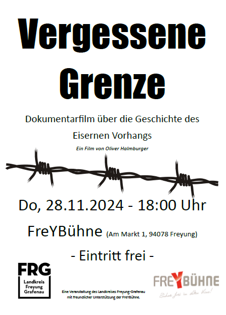Das Landratsamt Freyung-Grafenau lädt am Donnerstag, den 28. November 2024, zu einem besonderen Filmabend in die Freybühne in Freyung ein. Ab 18:00 Uhr wird dort die Dokumentation „Vergessene Grenzen“ kostenlos vorgeführt. Im Anschluss besteht die Möglichkeit, mit Zeitzeugen über die im Film behandelten historischen Ereignisse zu sprechen und Fragen zu stellen.